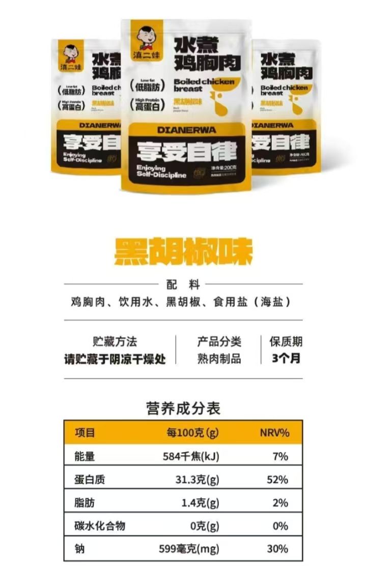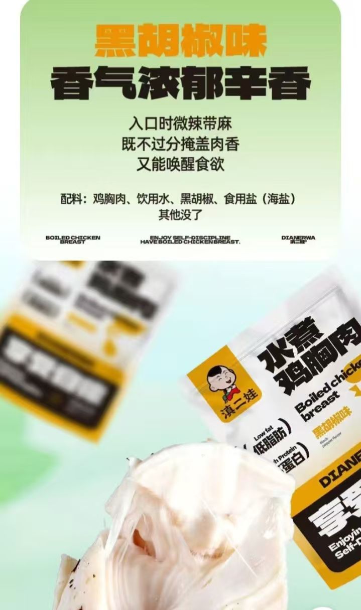 云南特产清二娃水煮鸡胸肉200克/(袋内含10小包)黑胡椒味2袋