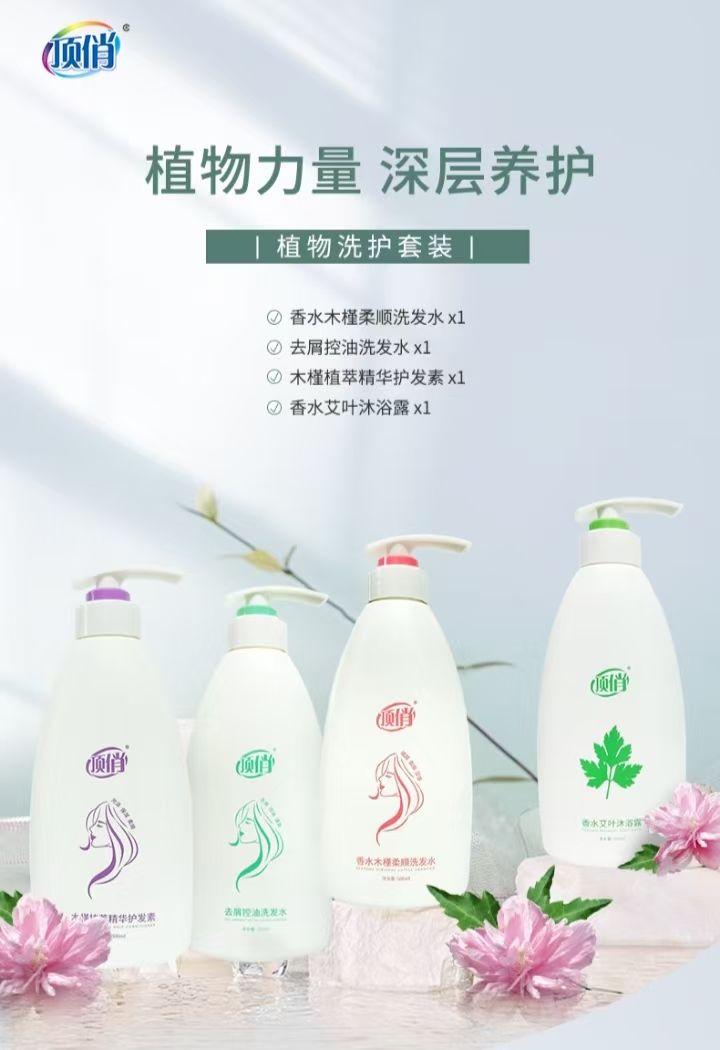 顶俏科技套装包含-香水洗发水1瓶-去屑洗发水1瓶-精华护发素1瓶-香水艾叶沐浴露1瓶,赠送衣物渗透清洁剂1瓶,一套全网同价